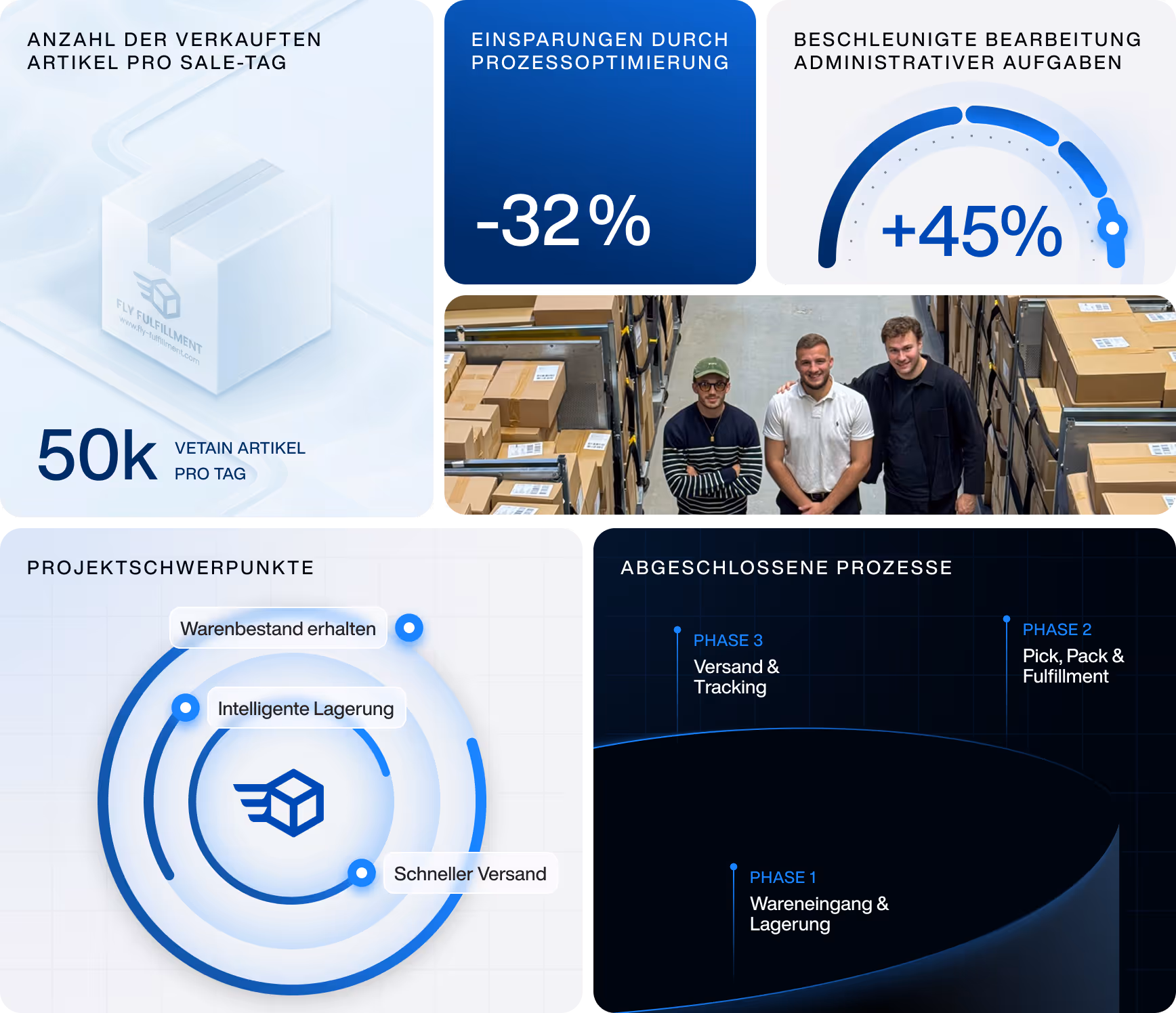 Wir bei fly fulfillment haben VETAIN dabei unterstützt, messbare Verbesserungen in allen Bereichen der Logistik zu erzielen. Die Liefergeschwindigkeit wurde deutlich erhöht, die Fehlerquote bei Kommissionierung fast eliminiert und die Kosten pro Bestellung spürbar reduziert.